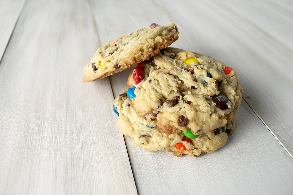 In a large mixing bowl cream your butter and sugars until well combined. Add your egg and vanilla mixing to combine. Add your flour, pudding mix, baking soda and salt, stirring to combine. Add chips and m and m’s stirring to combine.